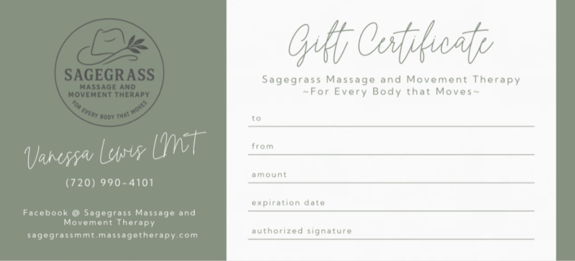 Gift certificates are available for purchase in person! These can be made out for an amount, not a particular service to ensure the recipient can get the massage(s) they are looking for! Contact me for more information and purchasing!